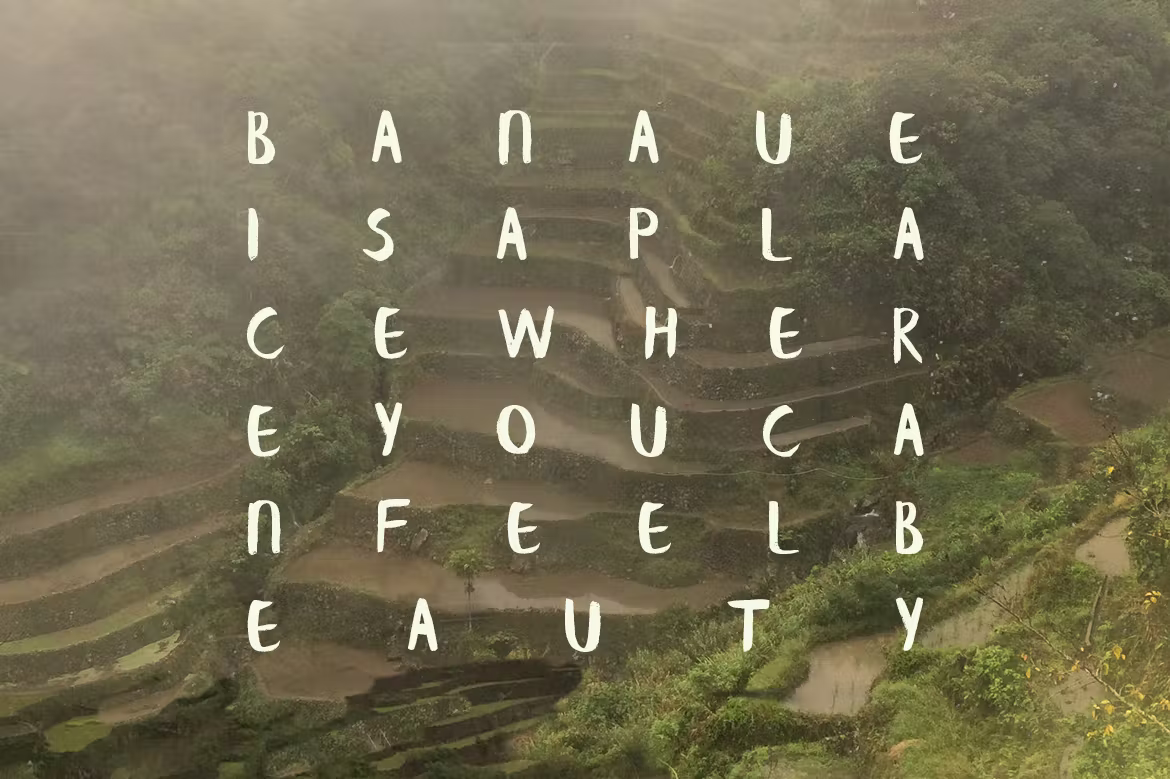 Banaue est une police de pinceau manuscrite pour un look fait maison. La police comporte 104 caractères et tous les glyphes de base. Le téléchargement contient un fichier .otf. Brossé à la main par Ieva Mezule. Le nom vient de Philippenes, Banaue est un lieu du nord. Des rizières en terrasses qui s’étendent autour des montagnes et le riz qu’elles produisent est uniquement destiné à l’usage local. La dame à l’imperméable bleu, qui apparaît sur l’image principale, était une planteuse de riz locale.
